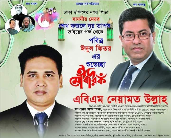 ঢাকা দক্ষিণ সিটি কর্পোরেশনের মাননীয় মেয়র ব্যারিষ্টার শেখ ফজলে নুর তাপসের পক্ষ থেকে দেশবাসীকে আসন্ন পবিত্র ঈদুল ফিতরের শুভেচ্ছা জানিয়েছেন বাংলাদেশ শিক্ষানবিশ আইনজীবী পরিষদ (BSAP) র কেন্দ্রীয় কমিটির সাধারণ সম্পাদক এবিএম নেয়ামত উল্লাহ ৷