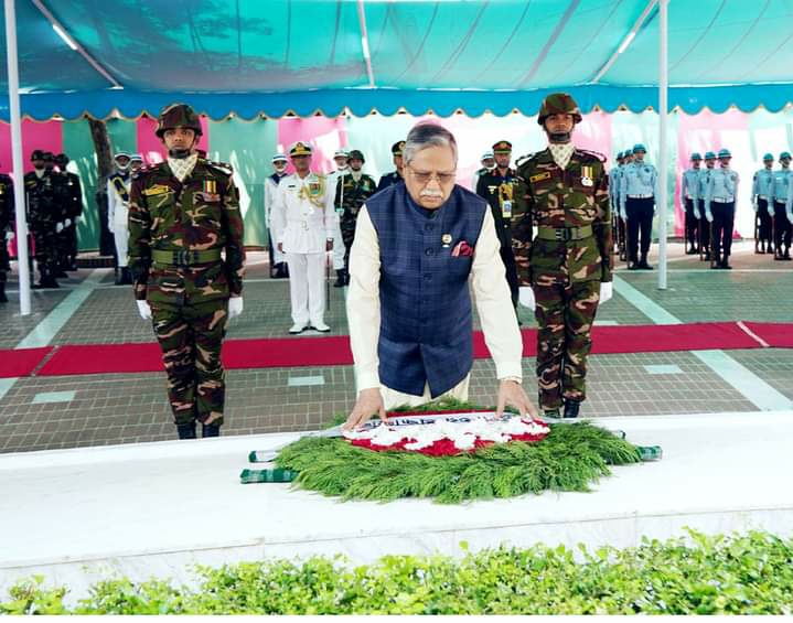 এসময় সেনা, নৌ ও বিমান বাহিনীর একটি চৌকস দল রাষ্ট্রীয় অভিবাদন জানায় এবং বিউগল করুন সুর বেজে ওঠে ৷ রাষ্ট্রপতি সাহাবুদ্দিন সেখানে কবর জিয়ারত, দোয়া এবং মোনাজাতে অংশ নেন ৷
