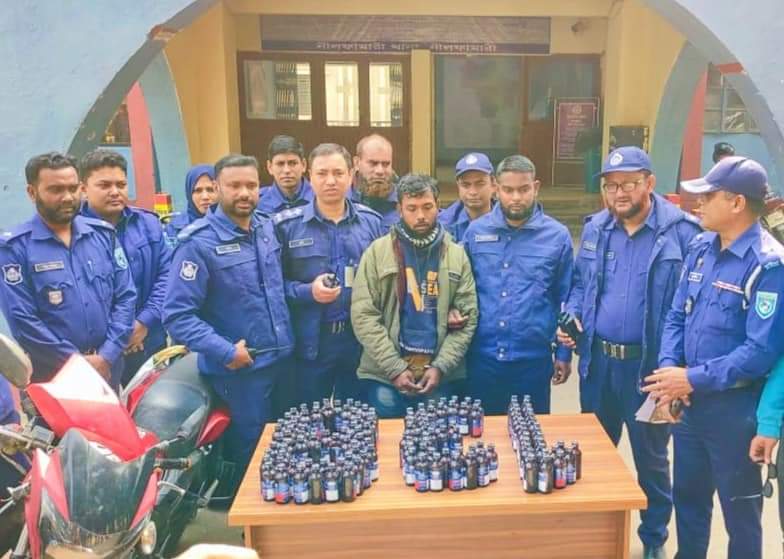 আজ মঙ্গলবার ২৩ জানুয়ারি সকাল ১১ ঘটিকায় ফেনসিডিল বহনকারী জিয়ারুল রহমান (৩০) পিতা মতিয়ার রহমান গ্রাম কেতকিবাড়ি বিশুু প্রসাদপাড়া হাতীবান্ধা লালমনিরহাট তার ব্যবহৃত টিভিএস আরটিআর এপাচী ১৬০ সিসি মোটর সাইকেলযোগে ১৩৮ বোতল মাদকদ্রব্য ফেনসিডিল লালমনিরহাট জেলা হাতিবান্ধা থানা হতে নীলফামারীতে সরবরাহ করার উদ্দেশ্যে আসলে নীলফামারী থানাধীন চারা সাইফুল হাজি মার্কেট বাজার সংলগ্ন খালুয়ার ব্রিজের উপরে দূর্ঘটনায় কবলিত হলে উক্ত মোটর সাইকেলের ব্যাটারী ও তেলের ট্যাংকির প্লাসিকের কভার ভেঙ্গে ফেনসিডিলের কয়েকটি বোতল বের হয়ে রাস্তার উপর পড়ে গেলে স্থানীয় লোকজন তাকে আটক করে। উক্ত সংবাদের ভিত্তিতে অদ্য ইং ২৩/০১/২০২৪ তারিখ সকাল ১১ ঘটিকায় নীলফামারী থানা পুলিশের একটি আভিযানিক মোবাইল টিম ঘটনাস্থলে উপস্থিত হয়ে সাক্ষী ও সাংবাদিকদের উপস্থিতিতে ধৃত আসামীর ব্যবহৃত মোটর সাইকেল হতে ১৩৮ বোতল মাদকদ্রব্য ফেনসিডিল উদ্ধার পূবর্ক জব্দ করা হয়। এ সময় তার ব্যবহৃত টিভিএস আরটিআর এপাচী ১৬০ সিসি মোটর সাইকেল জব্দ করা হয়।