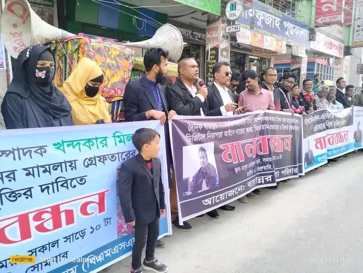 দৈনিক বায়ান্নর আলো পত্রিকার সহ-বার্তা সম্পাদক খন্দকার মিলন আল মামুনের বিরুদ্ধে ডিজিটাল নিরাপত্তা আইনে দায়ের করা মিথ্যা মামলা প্রত্যাহার ও নিঃশর্ত মুক্তির দাবিতে ঘণ্টাব্যাপী মানববন্ধন অনুষ্ঠিত হয়েছে।